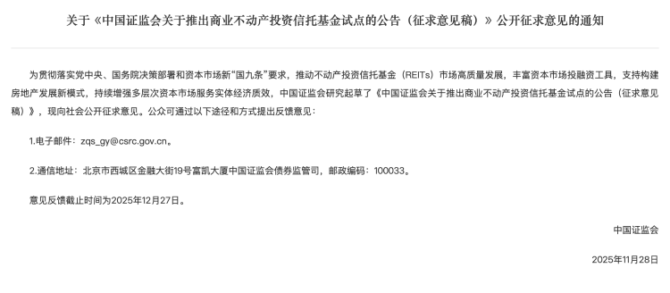 - 证监会就推出买卖不动产REITs试点公开征求意见2025-12-13