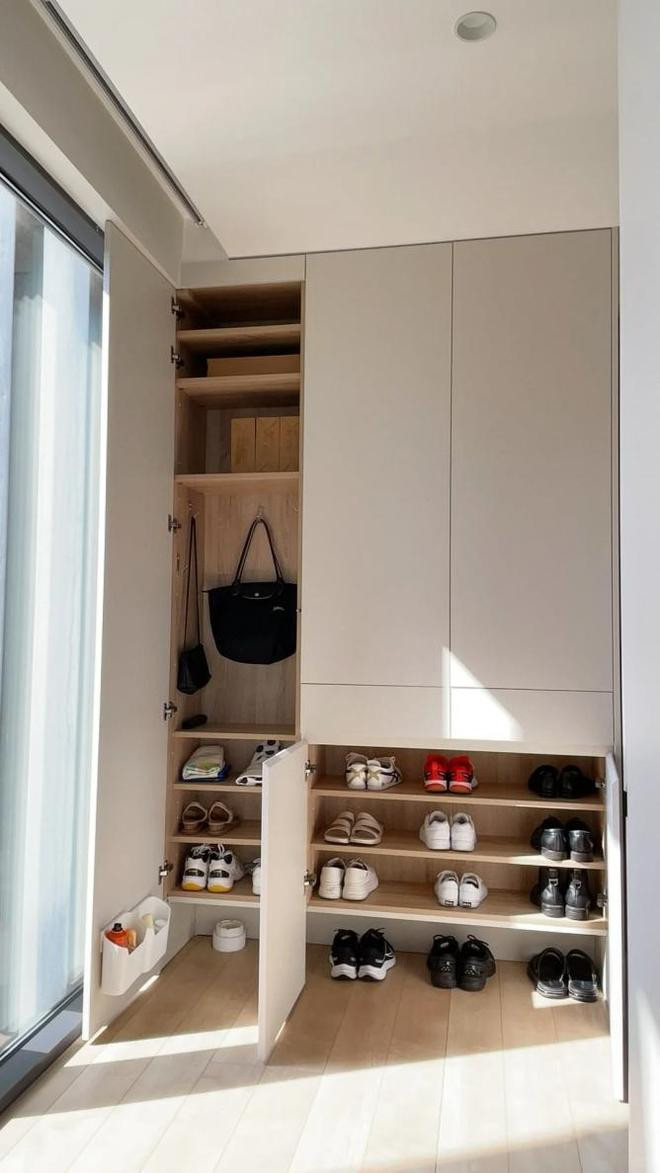 鞋柜的底部盘算时时会聘任悬空层,这样不错便捷透风和防潮。