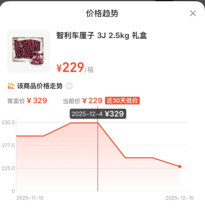 5斤装3J的智利车厘子,价钱从12月4日的329元一箱(65.8元/斤),下落到229元一箱(51.8元/斤),已降价100元/箱。