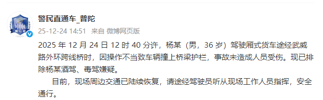 2025年12月24日12时40分许,杨某(男,36岁)驾驶厢式货车路过武威路外环跨线桥时,因操作失当致车辆撞上桥梁护栏,事故未形成东说念主员受伤。现已摒除杨某酒驾、毒驾嫌疑。