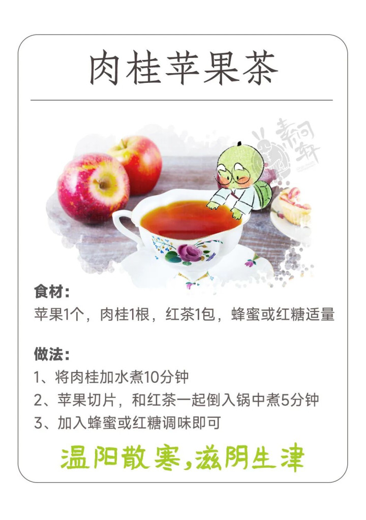 肉桂能缓解苹果的寒凉,苹果的酸味也能料理肉桂的温性,让茶方愈加良善,暖心又暖胃。