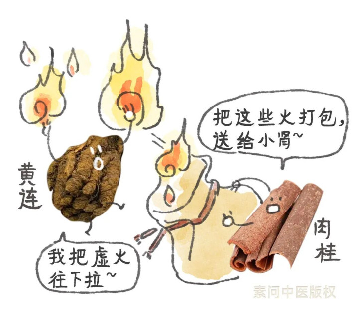 黄连入心,不错清心泻火,制约偏亢的心阳,让虚火向下走,不使其上炎。