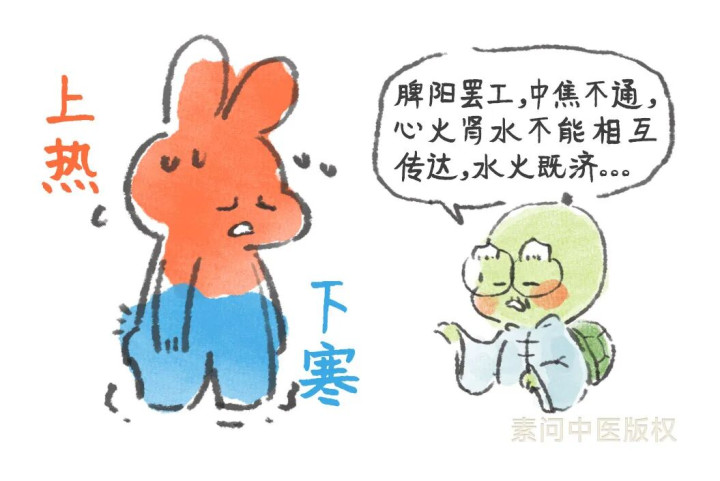 正确的作念法——要引火归元,也即是把上焦的火拽下来,去柔和下焦的寒。
